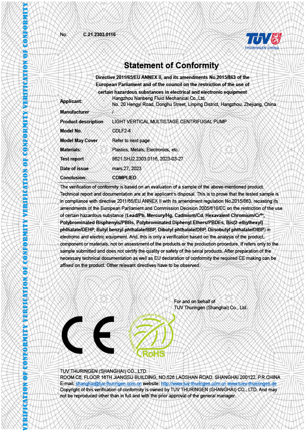 浙江制造認證證書-CDL(F)系列(電機功率0.37kW-7.5kW)